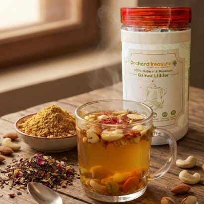 Experience the authentic taste of Kashmir with Orchard Treasure Premium Qahwa Lidder — a luxurious blend of handpicked herbs, spices, and dry fruits crafted to elevate your daily wellness ritual.